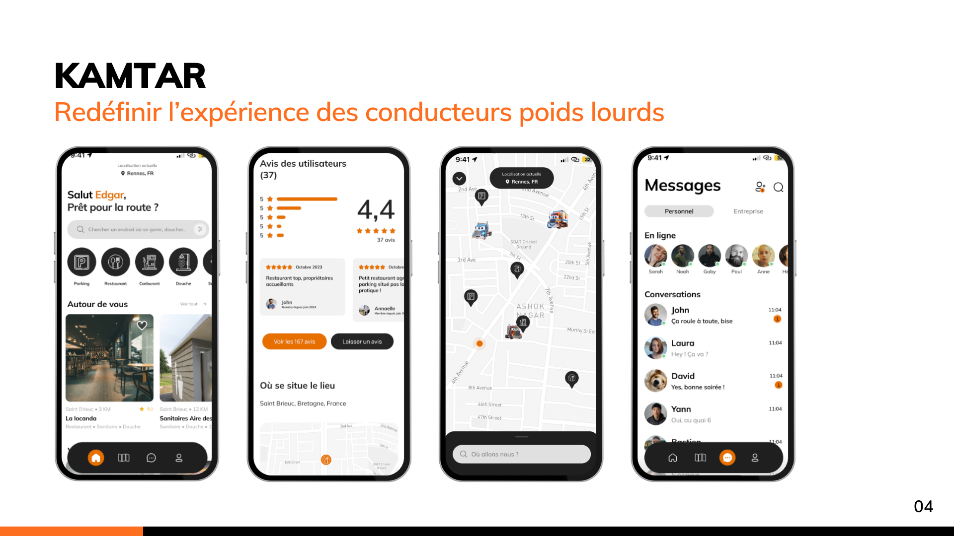 Dans le cadre de mon MBA, j’ai contribué au développement de Kamtar, une application mobile destinée aux conducteurs poids lourds. L’application vise à améliorer le quotidien des conducteurs poids lourds en leur permettant de localiser des points d’intérêt (restaurants, sanitaires, aires de repos) et de faciliter la communication entre eux grâce à un chat écrit et vocal.