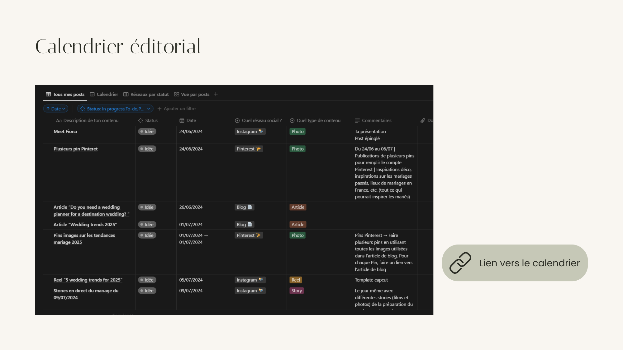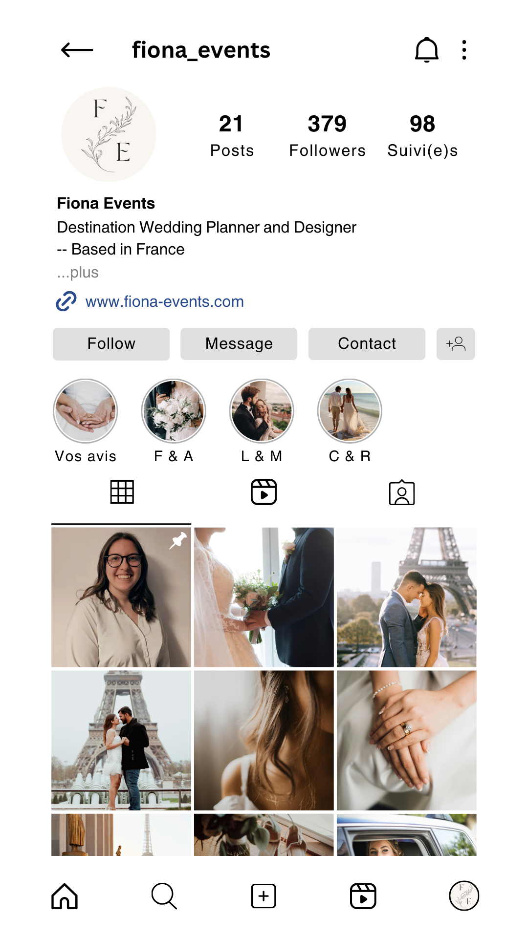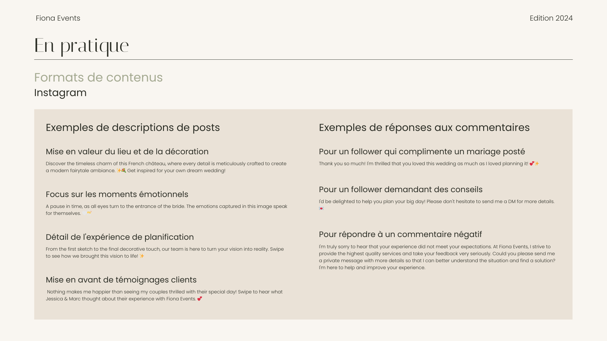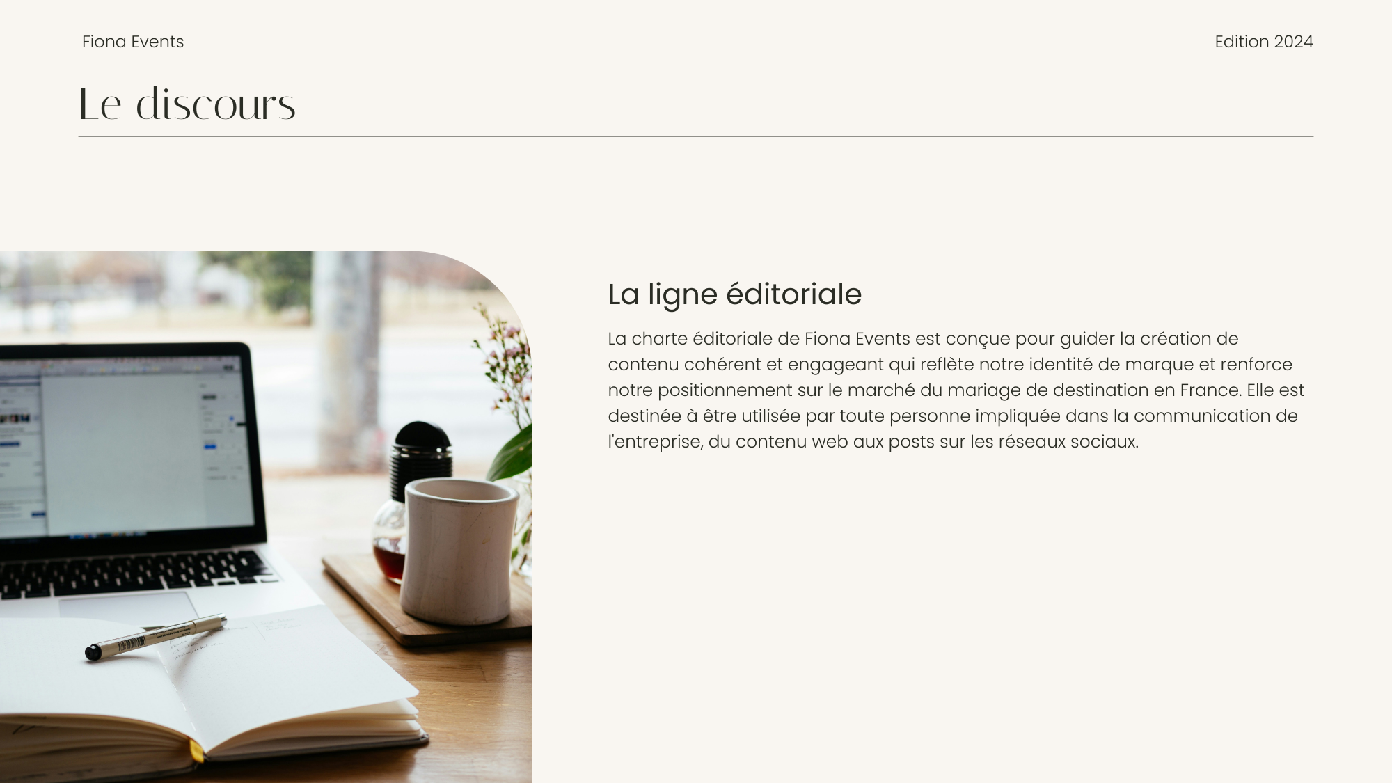 Dans le cadre d’une collaboration avec Fiona Events, j’ai eu le plaisir de redéfinir son identité graphique et de créer une charte graphique sur mesure, pensée pour capturer l’essence de ses événements. En approfondissant sa stratégie de communication, j’ai conçu une charte éditoriale et un calendrier éditorial, tout en développant des templates engageants pour les réseaux sociaux. Pour enrichir son univers visuel, j’ai constitué une base de photographies libres de droits, parfaite pour mettre en valeur son savoir-faire.