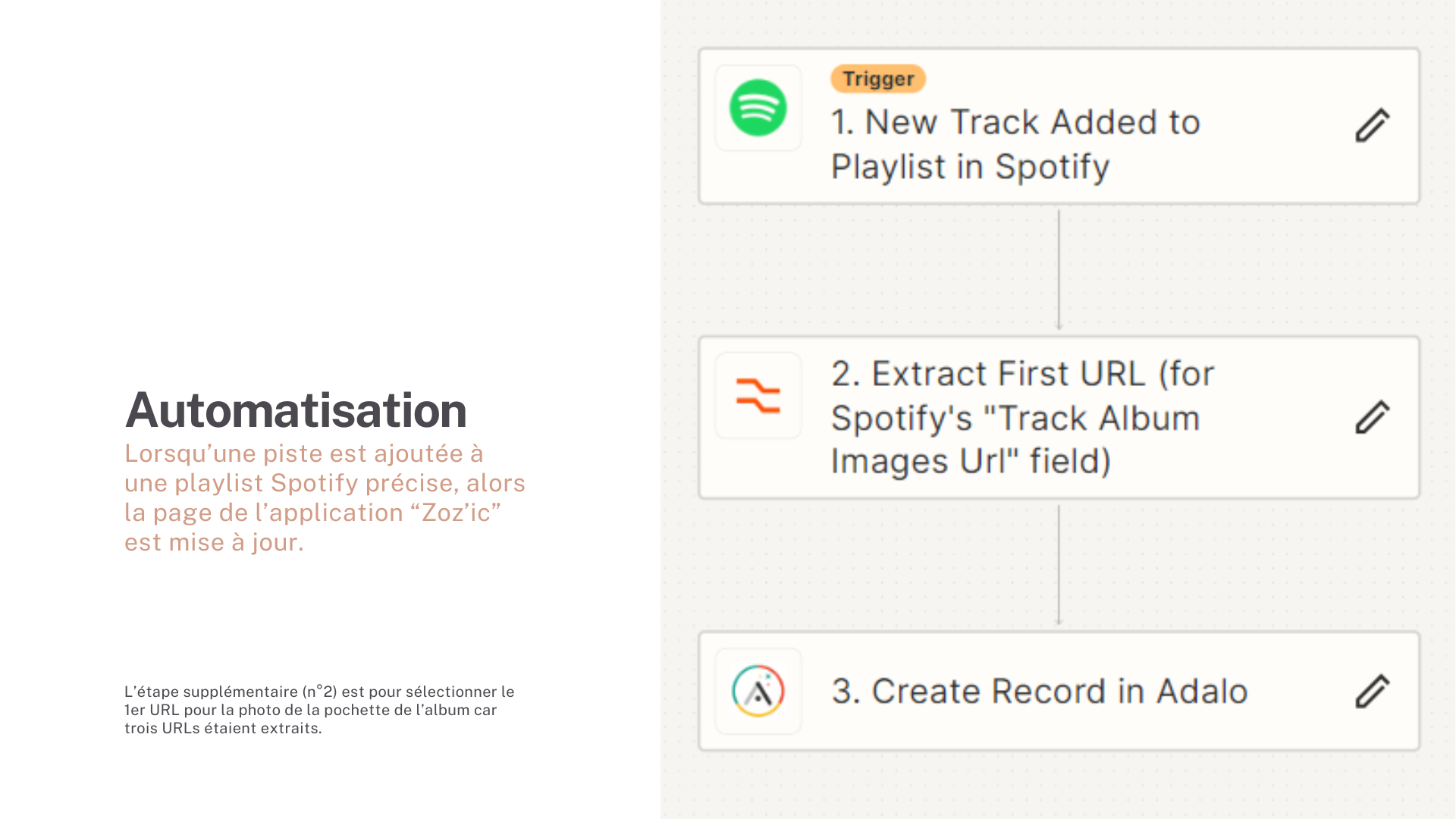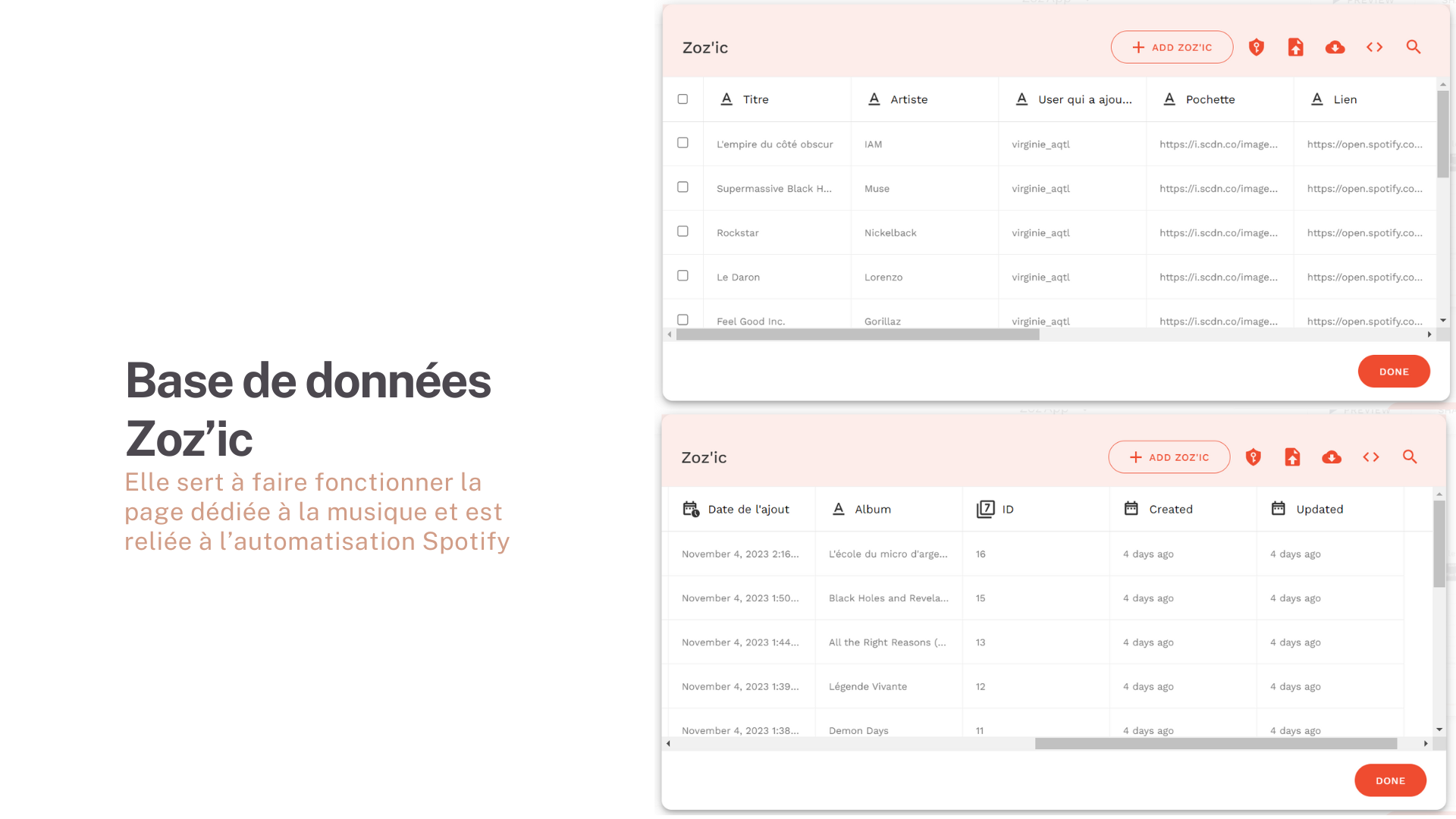 Dans le cadre de mon MBA en marketing digital, j’ai eu l’opportunité de réaliser une application en no code. Pour ce projet, j’ai utilisé le logiciel Adalo pour créer Zoz’App. J’ai également utilisé Zapier pour automatiser des actions entre Spotify et mon application. De plus, j’ai utilisé Airtable pour gérer mes bases de données.